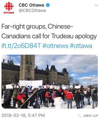 $ M4 v5 z; U0 Q1 @& G; {8 H8 v2 Y这是CBC的报道,他们在推特上的描述直接就是Far-right groups, Chinese-Canadians call for Trudeau apology,翻译成中文就是:"极右组织、加拿大华人呼吁特鲁多的道歉"。是不是想骂人。也许真的有极右组织也去凑热闹了,可就能这样报道?那任何游行,都会有各种意想不到的人去凑热闹,是不是也可以把他们放到前面,和正经的参与朋友相提并论?