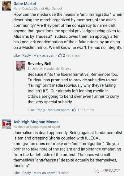 / U5 ^! \8 r8 n. Y5 B2 Y' D另一位则说,怎么可以将亚裔社区组织的游行描述成反移民?难道他们是特鲁多给穆斯林特殊待遇的阴谋的一部分?甚至,有一位发出了“媒体业已死”的哀叹。