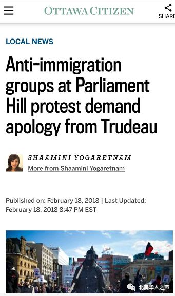 # F3 o! N. p& x J- h/ l4 D上面这则报道,则是某个叫什么加拿大公民的网站。标题赫然是“反移民组织在国会山要求特鲁多的道歉”。恩,加拿大华人成反移民组织了。这该是有多恨华人啊。这又该是有多么的视事实如粪土啊!