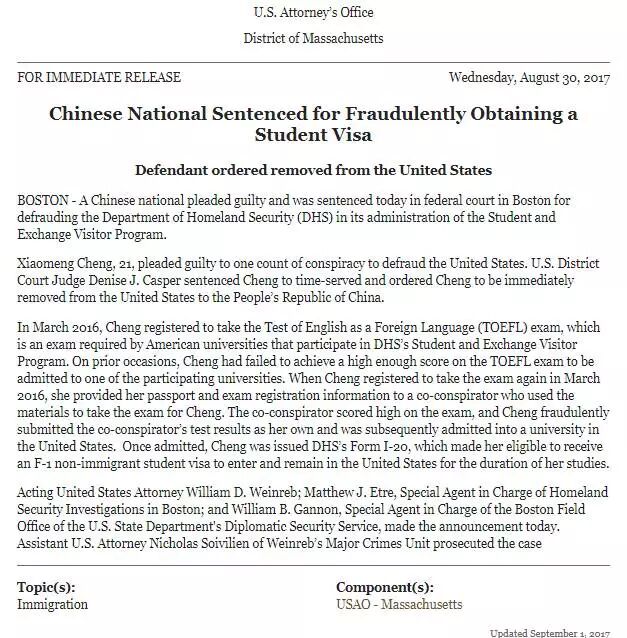 今年8月30日,美国马萨诸塞州地方检察署发布公告称,留学生Xiaomeng Cheng托福成绩被证实作弊,涉嫌欺诈美国政府罪名成立,判决驱逐出境,转天也就是8月31日就被遣返回国!
