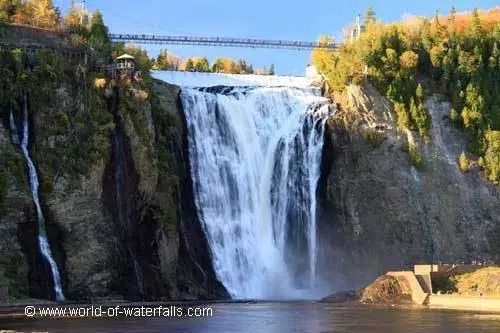 蒙特伦西瀑布(Montmonency Fall) 位于魁北克市北部,由蒙特伦西河从83米高的山壁垂直落下所形成。连绵不绝的流水从百丈山壁垂直落下,在圣劳伦斯河中溅起阵阵水雾,气势磅礡。