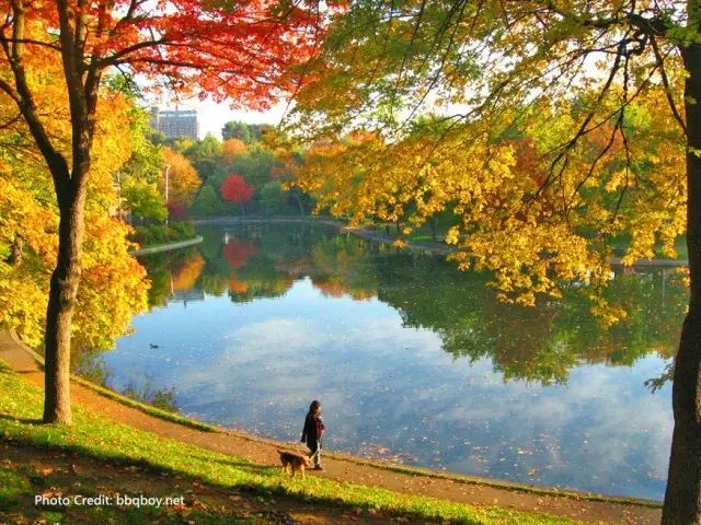 4 o% B! X5 ~9 P: P! M% P7 g站在湖边,但见一池弯弯静谧的湖水,周围尽是层层叠叠,色彩斑斓的枫树映入眼帘。走在沿湖的小径上,时不时会有松鼠窜出,带给游人意外的惊喜。