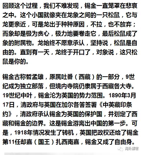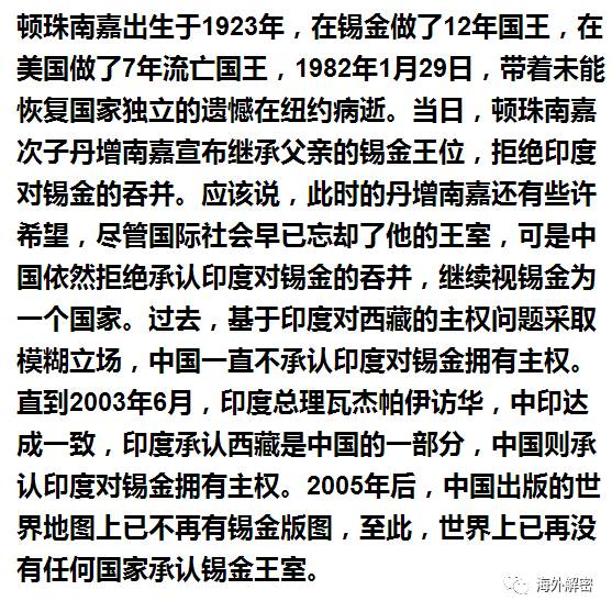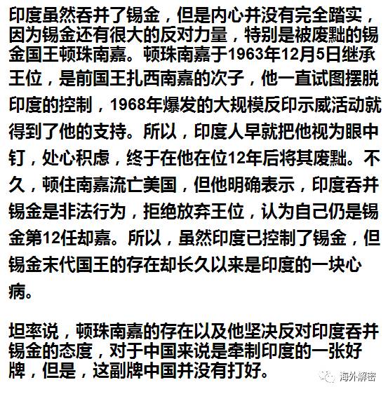 锡金命运的真正逆转发生在印度独立之后。英国人走了,印度认为机会来了。1947年,印度与锡金签订《维持现状协定》,继续往锡金派驻专员,此时,印度人俨然取得了英国人当年的地位。与此同时,扶持锡金国大党发起不合作运动,要求国王进行改革。1950年12月,通过签订《印度锡金和平条约》,印度将锡金变为自己的保护国,攫取了锡金的国防、外交和经济大权。1968年8月,锡金首都甘托克爆发反印示威,要求废除《印度锡金和平条约》,争取独立。印度急忙调派大批军警前去镇压,成千上万名锡金民众被打死打伤,数千人遭到逮捕。1973年4月,印度强行对锡金实行军事接管。两个月后,印度操控的国大党在议会强行通过宪法修正案,使锡金成为印度的“联系邦”。锡金民族党及其支持者被迫进行武力对抗,但随后遭印军镇压。1975年4月9日,印度军队解除了国王卫队武装,软禁了国王顿珠南嘉。随后,由印度操控的锡金议会宣布废黜国王,几天后通过“公投”宣布并入印度,5月16日,印度议会宣布锡金正式成为印度的一个邦。看猛料点击此处