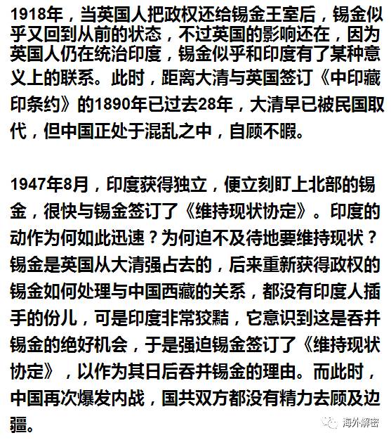 到了1950年12月,印度通过《印度锡金和平条约》正式将锡金作为自己的“保护国”,而此时抗美援朝爆发,中国全部精力都集中在朝鲜半岛,锡金完全不在中国的视线之内。而后来印度对锡金实行军管、策划所谓宪法修正案以及废黜锡金王室,都是趁70年代中国文革混乱之际,以卑劣手段完成,实为趁火打劫,而这个“火”是烧在中国这边,是中国内部的乱局给了印度机会,在锡金需要帮助时,中国无力伸出援手,以至于眼睁睁看着印度吞并了锡金。否则,即便锡金不回归中国西藏,也可以以一个独立的喜马拉雅山国横在中印之间,成为一个缓冲地带,甚至中国可以借助其特殊的地理位置牵制印度。可是,在印度独立后,锡金不但失去了和西藏融合的可能,最终连自己的国家身份也失去了。