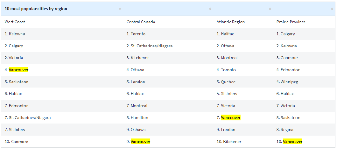 从大区来看,即使是西海岸居民,温哥华在他们眼中也不算很有吸引力,仅排第4,西海岸居民最想移居的城市第一是基隆拿、其次是卡尔加里和维多利亚。对于其他地区的居民来说,温哥华的吸引力就更小了。; O. S; Y+ s @' G6 S1 X