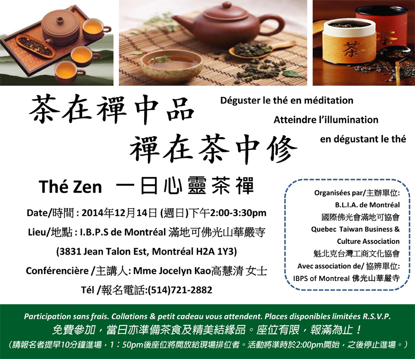 [吃喝玩乐] 魁北克台湾工商文化协会举办免费“一日心灵茶禅”活动[蒙特利尔] |