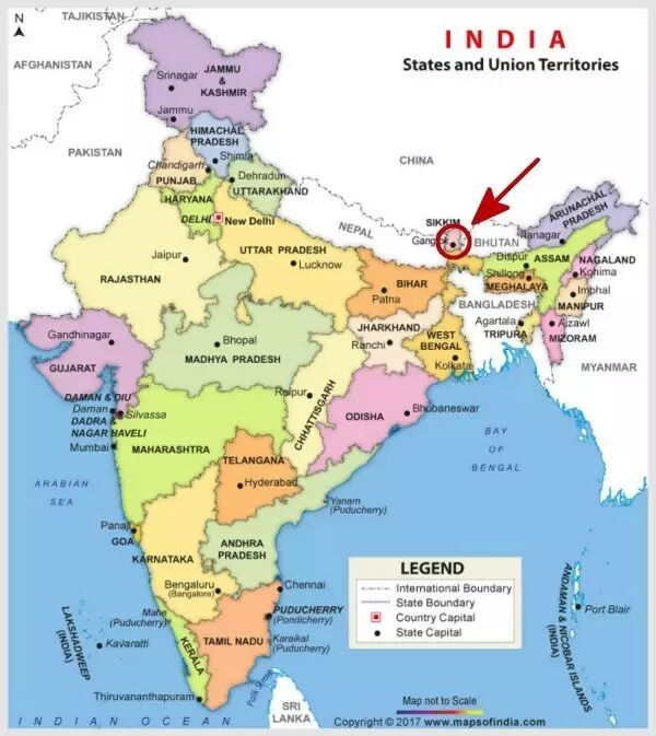 印度版印度地图,箭头所指为“锡金邦”