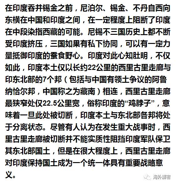 其二,可打破尼泊尔、锡金、不丹三国互相协作,共同抵御被印度蚕食的能力。在锡金变成印度的锡金邦后,尼泊尔和不丹已成隔印相望的状态,三国合力不复存在;