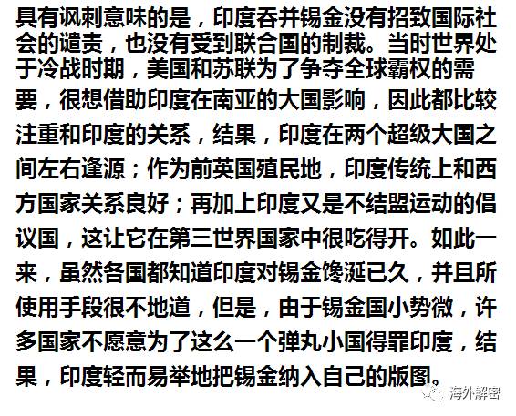 到了1950年12月,印度通过《印度锡金和平条约》正式将锡金作为自己的“保护国”,而此时抗美援朝爆发,中国全部精力都集中在朝鲜半岛,锡金完全不在中国的视线之内。而后来印度对锡金实行军管、策划所谓宪法修正案以及废黜锡金王室,都是趁70年代中国文革混乱之际,以卑劣手段完成,实为趁火打劫,而这个“火”是烧在中国这边,是中国内部的乱局给了印度机会,在锡金需要帮助时,中国无力伸出援手,以至于眼睁睁看着印度吞并了锡金。否则,即便锡金不回归中国西藏,也可以以一个独立的喜马拉雅山国横在中印之间,成为一个缓冲地带,甚至中国可以借助其特殊的地理位置牵制印度。可是,在印度独立后,锡金不但失去了和西藏融合的可能,最终连自己的国家身份也失去了。